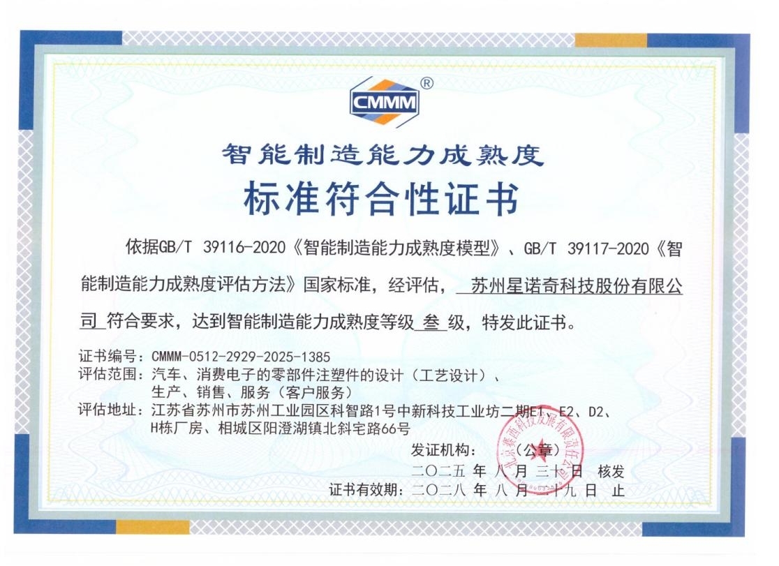 近日,苏州星诺奇科技股份有限公司顺利通过国家智能制造能力成熟度(CMMM)三级(集成级)评估认证。